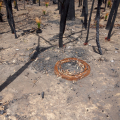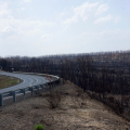 Ich fahre weiter, rechts und links durch eine schwarz verkohlte Landschaft. Mir fällt auf, dass ich mich sicher im Auto fühle, habe genug Benzin im Tank und zu Trinken dabei. Aber damit bleibt alles in gewisser Weise unwirklich und distanziert. Was wäre wenn das Auto liegen bleiben würde!