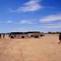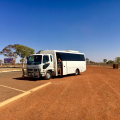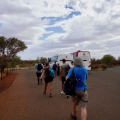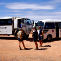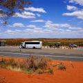 Wir besteigen einen mittelgroßen klimatisierten Reisebus, sammeln noch paar weitere Teilnehmer in Alice Springs auf und fahren dann in Richtung Südwesten zu unserem eigentlichen Ziel den großen Felsformationen Uluru und Kata Tjuta. Das wir dazu erst eine Strecke von fast 500 Kilometern zurück legen müssen, wird uns erst jetzt klar. Wir sind eine bunte Truppe, Deutsche, US-Amerikaner, Argentinier, Belgier, Schweizer und Japaner. Unser Guide ist Christie, eine Engländerin und eine nette Französin, deren Namen wir leider vergessen haben, wird für uns Kochen.