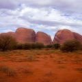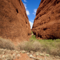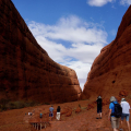 Unser erstes Ziel ist eine Gruppe von 36 Bergen, die Kata Tjuta (Olgas) in Zentralaustralien etwa 51 Kilometer entfernt von dem Ort Yulara wo unser erstes Zeltlager für die Nacht sein wird. Kata Tjuṯa stammt aus der Sprache der Aboriginals den lokalen Stämmen der Anangu und steht für viele Köpfe, was die Felsformation gut beschreibt. Wir laufen zwischen zwei der langgezogenen Köpfe, der Weg ist gut ausgebaut, was wir sehr oft in Neuseeland vorgefunden haben, setzt sich auch in Australien fort. Einerseits ist damit die Ursprünglichkeit verloren gegangen, aber angesichts der tausenden Touristen die die Sehenswürdigkeiten besuchen wird man das verstehen und akzeptieren. Wie schnell würden wir Touristen die Schönheit der Natur zerstören.