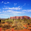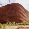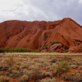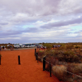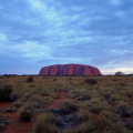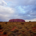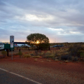 Am Abend fahren zum Sonnenuntergang zum Uluru. Leider liegt eine Wolkendecke über dem ganzen Land, so dass der Uluru doch ziemlich unscheinbar wirkt und wir versucht sind enttäuscht zu sein, zumal man immer die perfekten Bilder der Hochglanzmagazine im Kopf hat. Aber vielleicht haben wir Glück. Und tatsächlich, die Wolkendecke läßt am westlichen Horizont eine Lücke, gerade rechtzeitig, kurz bevor die Sonne ganz untergeht, erleben wir den Uluru in einem tiefen, dunklem Rot an diesem Abend und sind fasziniert.