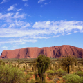 Am nächsten Tag heißt es aufstehen um 4 Uhr, damit wir früh genug zum Sonnenaufgang am Uluru sind, deren nördlichen Teil wir umwandern wollen. Ein weiterer Grund früh die Wanderung zu machen, ist die Hitze, und tatsächlich wird der Weg deswegen ab 11 Uhr offiziell gesperrt. Auch heute morgen wieder eine fast geschlossene Wolkendecke, aber dann tut doch wieder eine Lücke in den Wolken zu und die Sonne, die gerade über dem Horizont erscheint, läßt den Uluru leuchten.